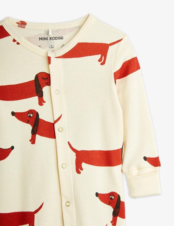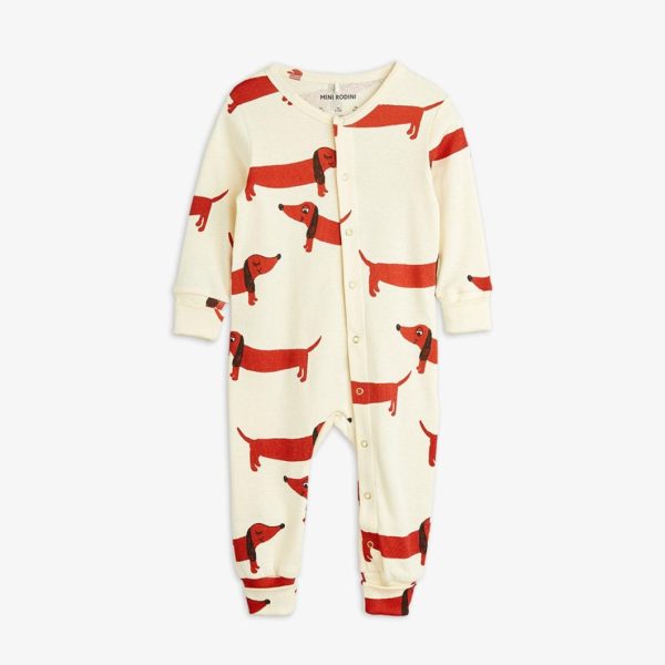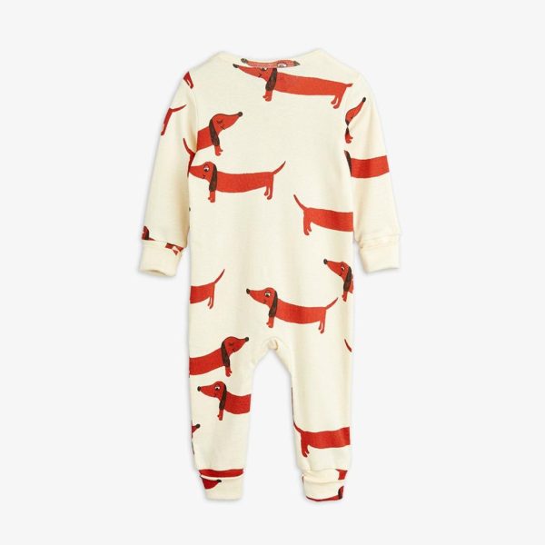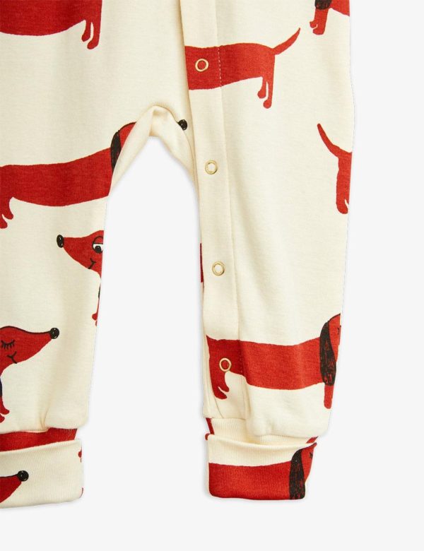 Jumpsuit with all over Dog print, made of 100% GOTS-certified organic cotton. Designed with foldable cuffs and snap buttons at the front for easy dressing.