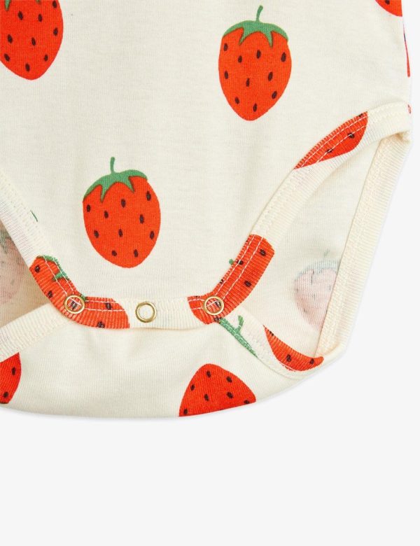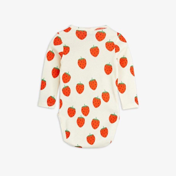 Off white long sleeve bodysuit with an all over Strawberries print, made from GOTS certified organic cotton.Features