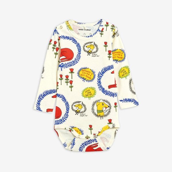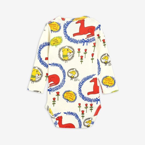 Bodysuit with an all over sighthound print, made in 100 % organic cotton. The body is designed with long sleeves and snap buttons at the shoulder and crotch for easy dressing.