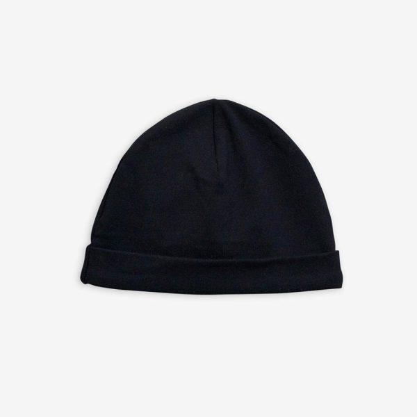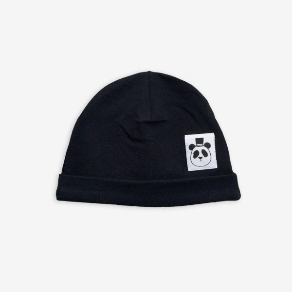 Black fold up baby beanie in soft TENCEL™ Lyocell with a hint of stretch for comfort. The beanie features a Mini Rodini Panda label.