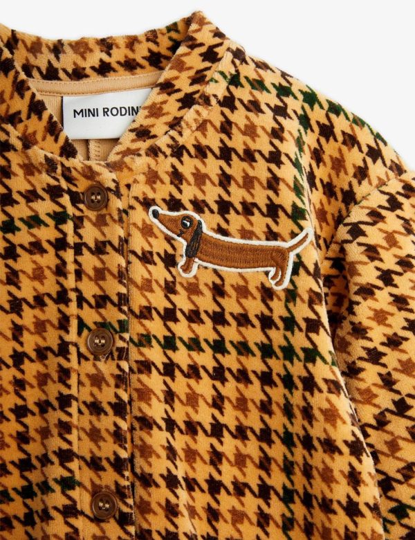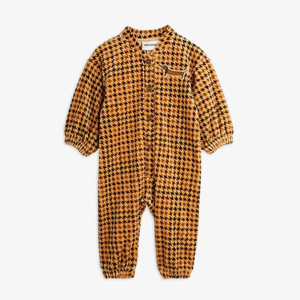 Velour baby jumpsuit with an all over Houndstooth pattern and an embroidered Dog patch, made from 100 % GOTS certified organic cotton. Designed with dropped shoulders, puffed sleeves, button closure and elastic trims at arm and leg ends.