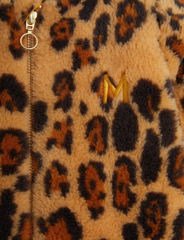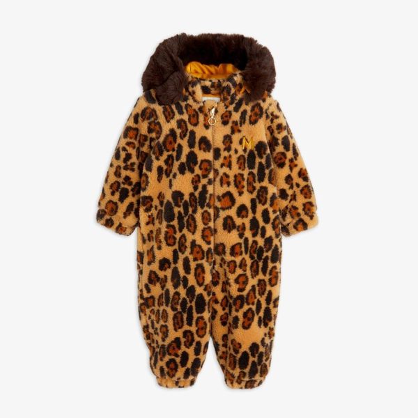 Designed in a leopard print with contrasting removable hood and elastic cuffs at leg and sleeve end. Decorated with and an M embroidery in front.