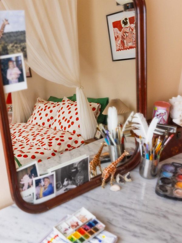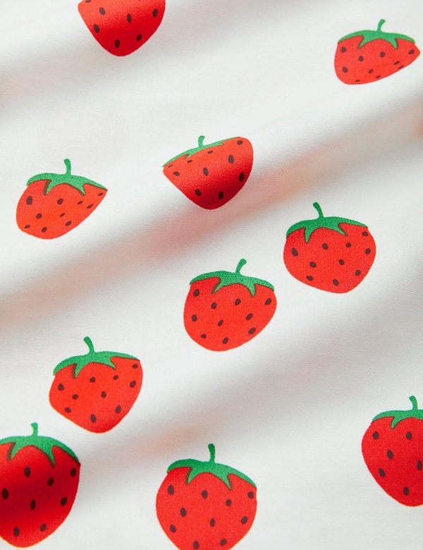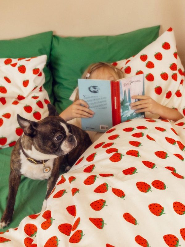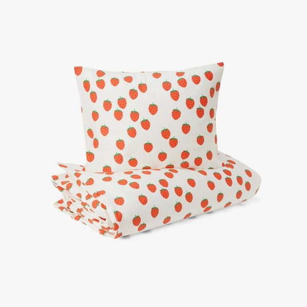 Duvet cover and pillowcase decorated with an all over Strawberries print, made from 100 % GOTS certified organic cotton satin. Duvet cover measures 150 x 210 cm and the pillowcase measures 50 x 60 cm.