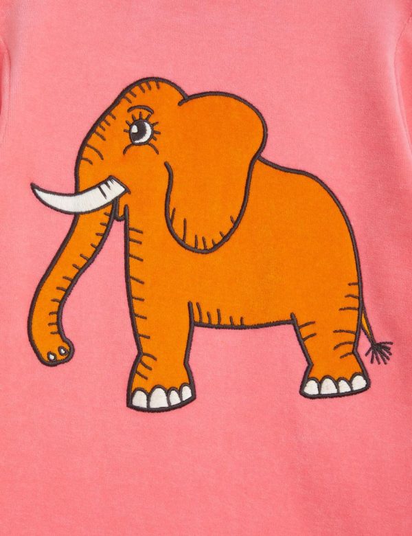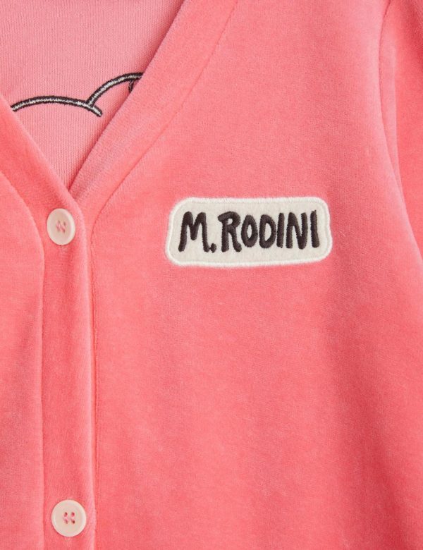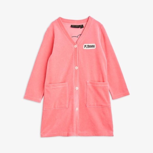 Pink velour robe featuring an M.Rodini patch on the chest and a large 4 Elephants embroidery on the back, made from 100 % GOTS certified organic cotton velour. Designed with two front pockets and white corozo buttons in the front.
