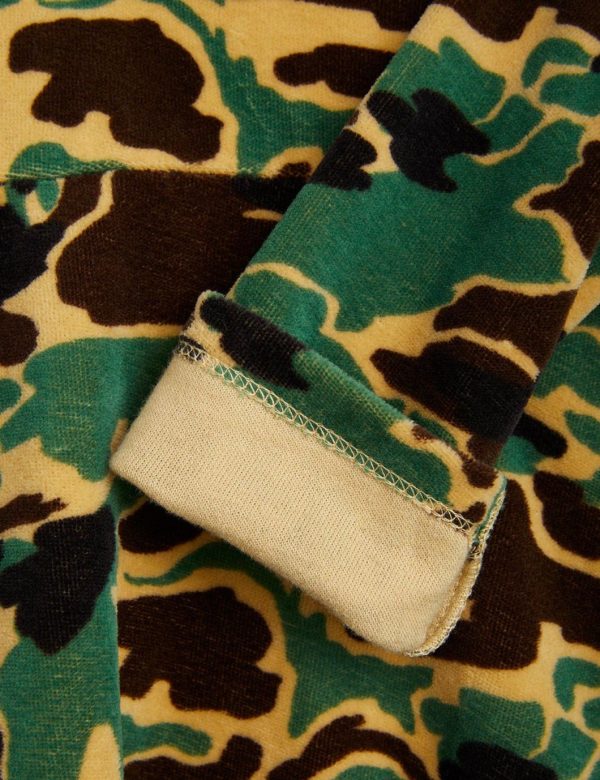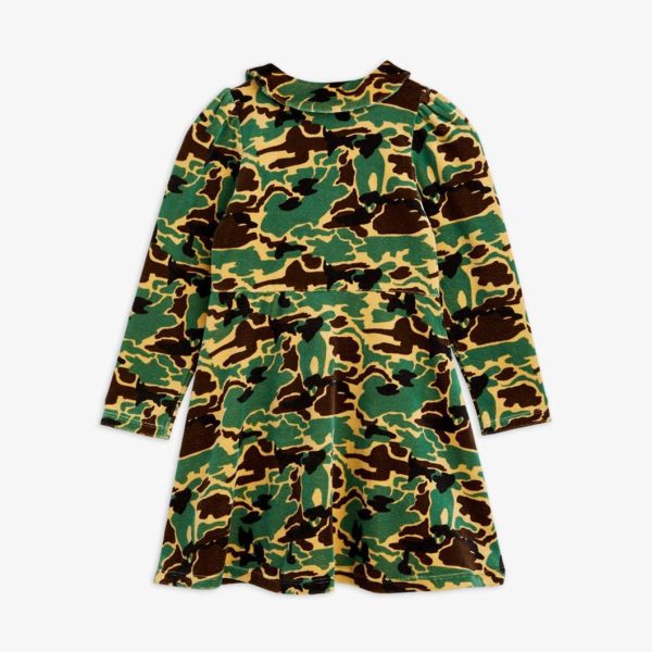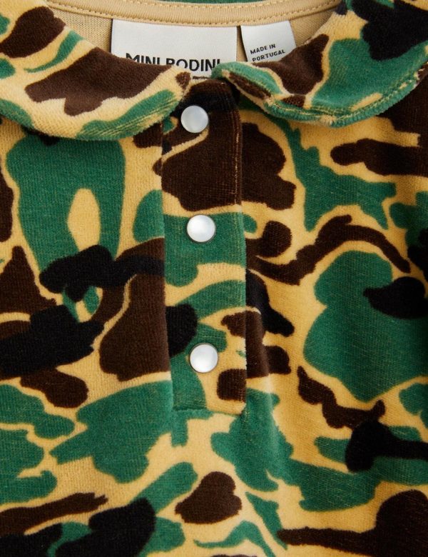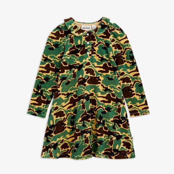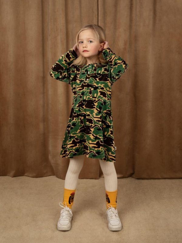 Velour dress with our camo pattern, made from 100 % GOTS certified organic cotton. Designed with a rounded collar and “pearl” snap buttons on the front. Finished with a Mini Rodini Panther label.