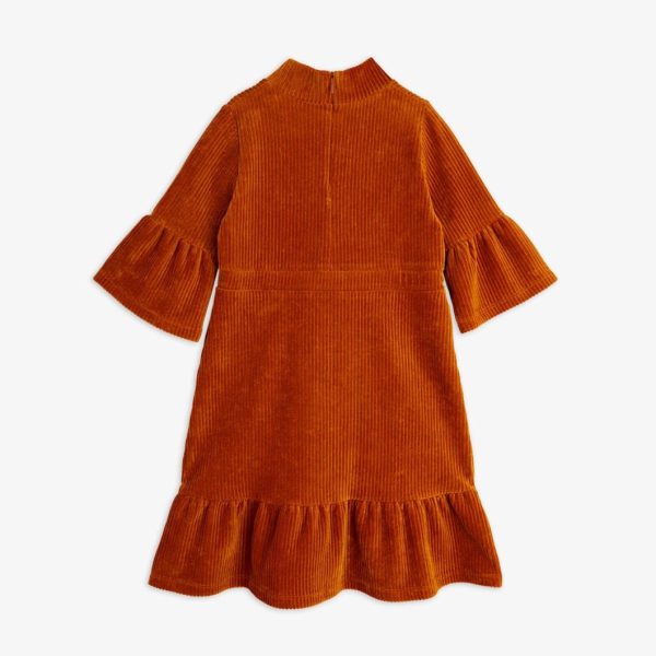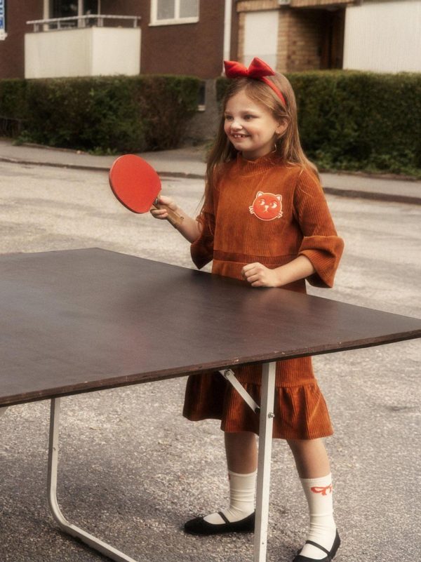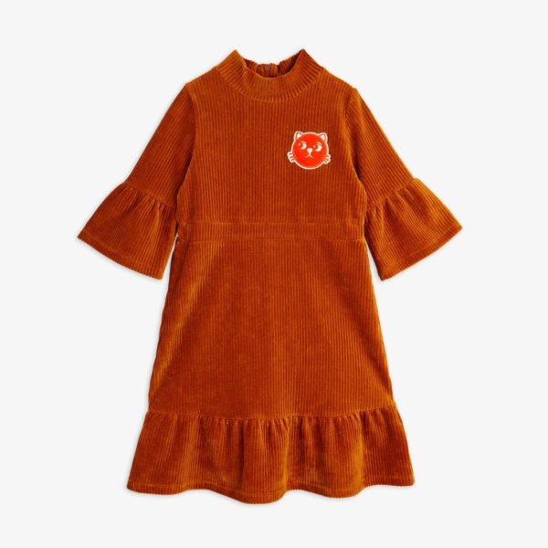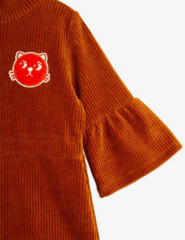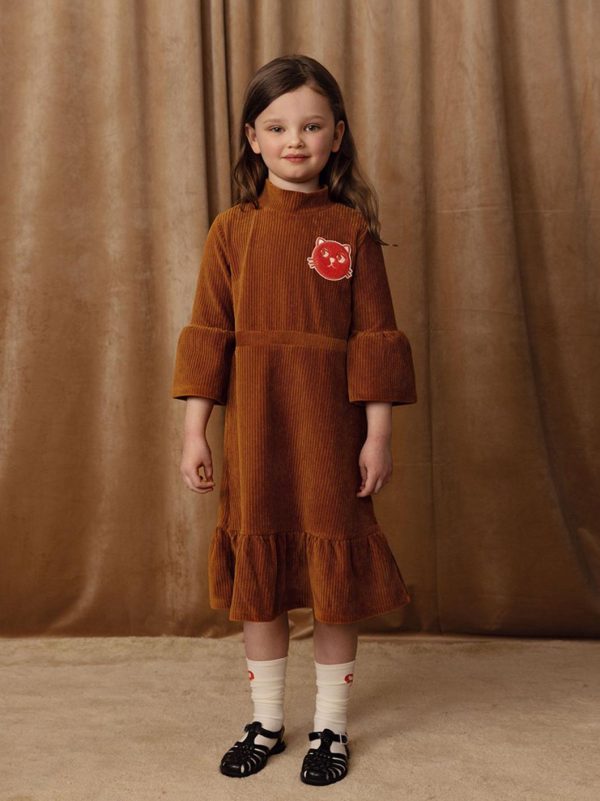 Velour corduroy dress made in organic cotton and recycled polyester. Designed with a polo collar, trumpet sleeves and a draped skirt. Decorated with a cat appliqué. The model is 123 cm tall and is wearing a size 116/122.