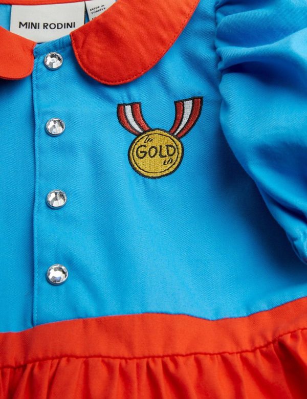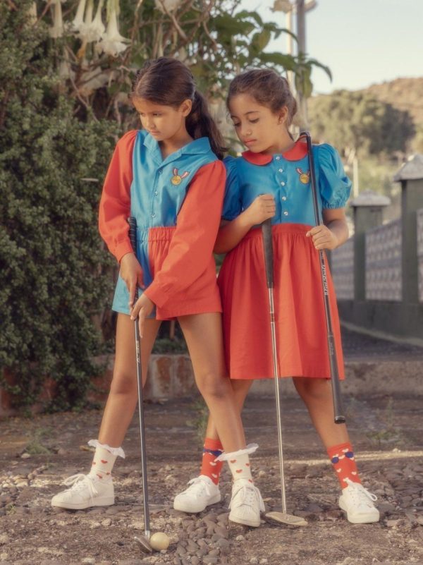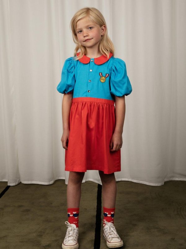 Dress made from 100 % GOTS certified woven organic cotton. Designed with puff sleeves, a rounded collar, “Diamond” snap buttons in the front and finished with a Medal embroidery.