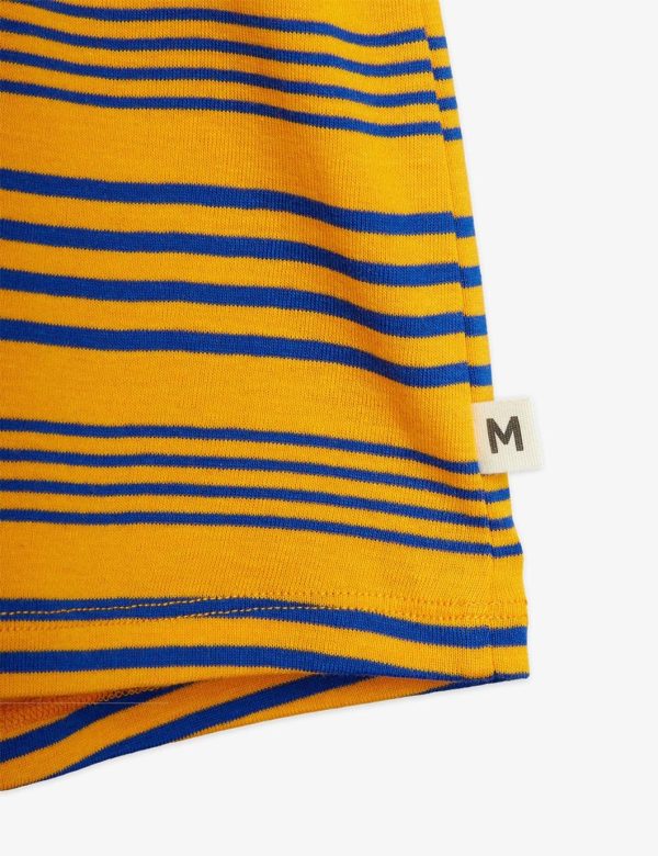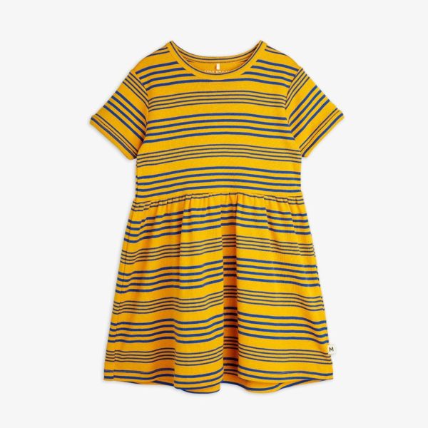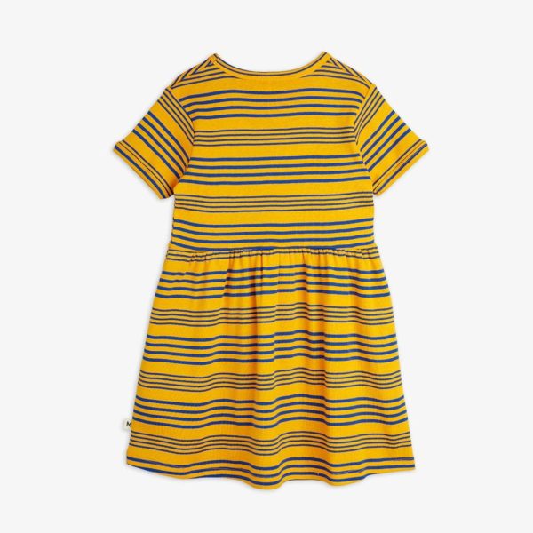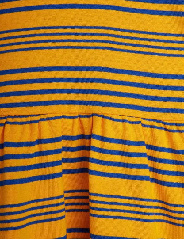 Short sleeve dress in a warm toned multi stripe pattern. Made from 100 % GOTS-Certified organic cotton. Features bindings at neck and sleeve ends.Features