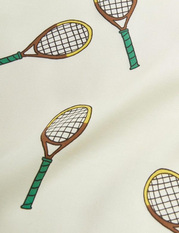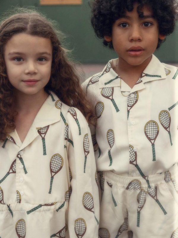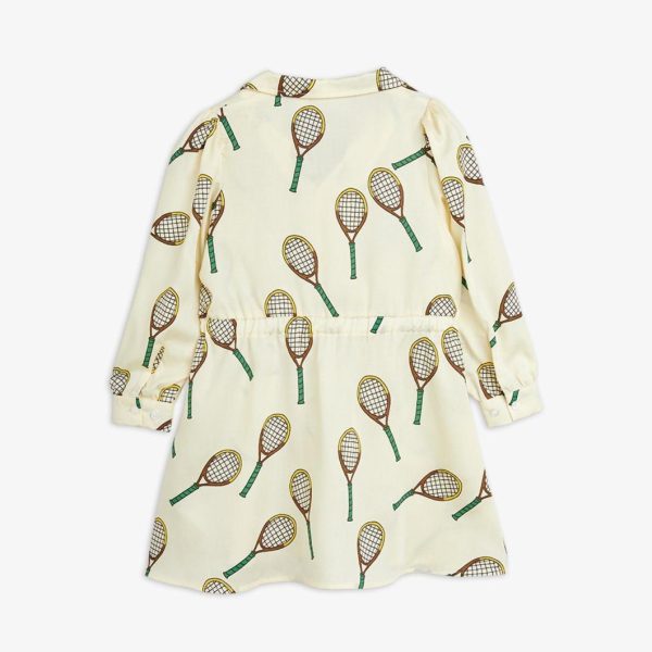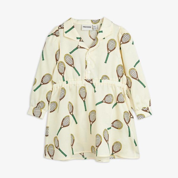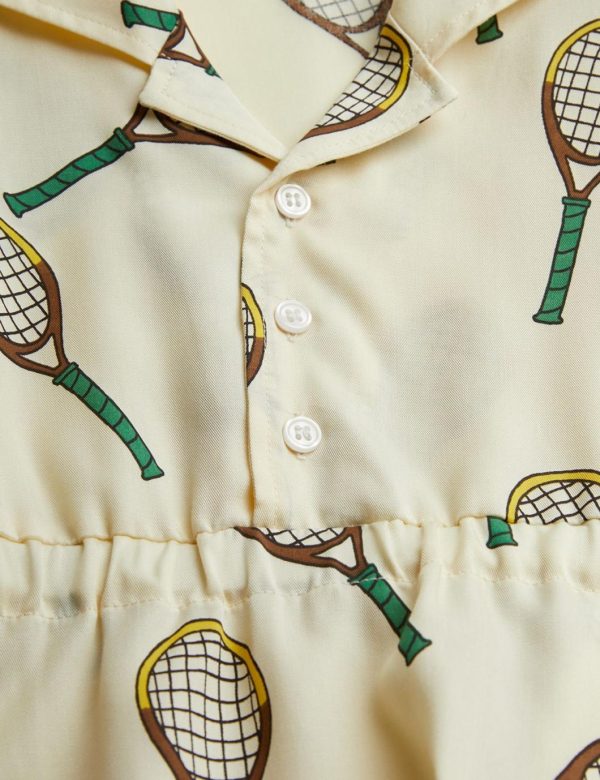 Dress made from 100 % TENCEL™ Lyocell. Designed with button closure, cuban collar, puffed sleeves and elastic waistband. Decorated with an all over Tennis print.