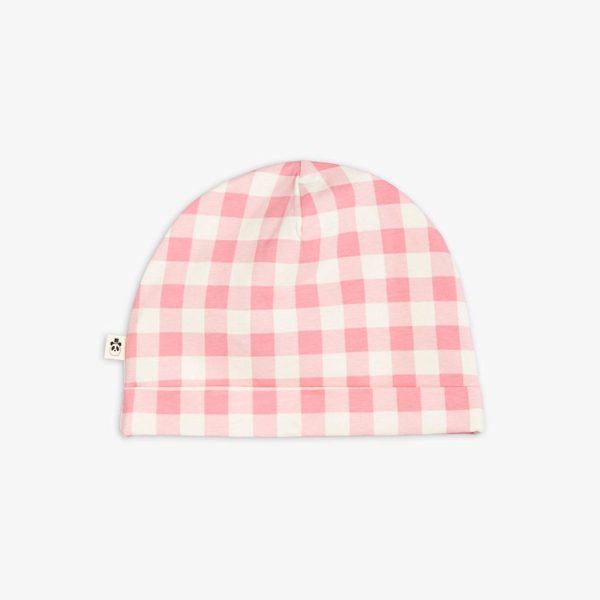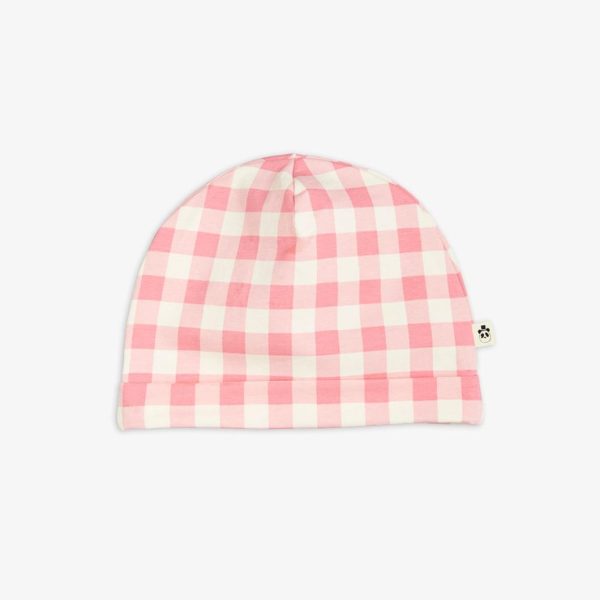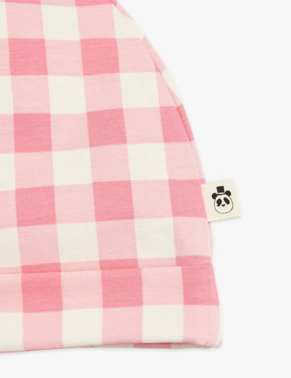 Beanie with pink Gingham Check print made from GOTS certified organic cotton with stretch for extra comfort. Designed with a folded hem and a sewn-on Mini Rodini Panda logo.