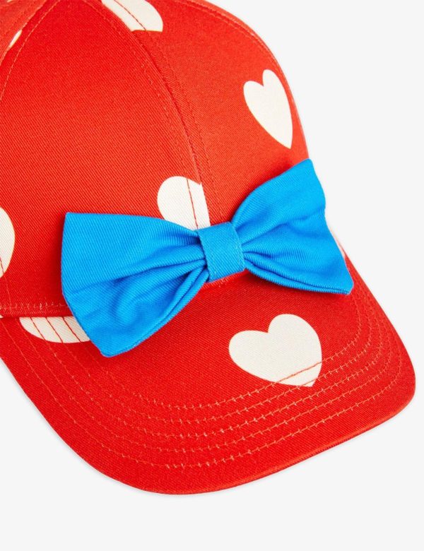 Baseball cap decorated with a sewn on bow and an all over Hearts print, made from 100 % organic cotton. The cap features an embroidered M.Rodini logo on the back and is adjustable with a metal buckle for the perfect fit.