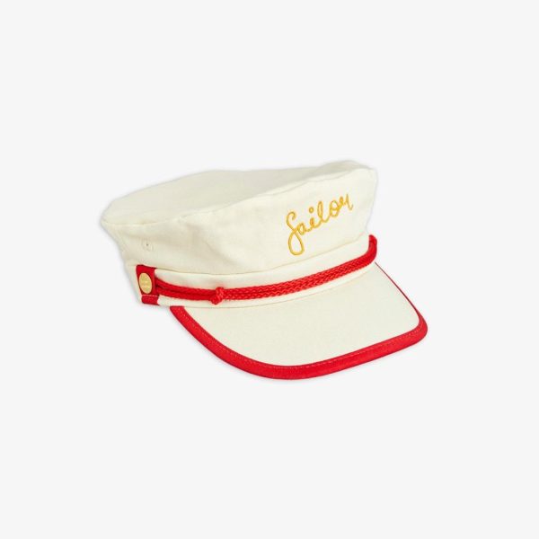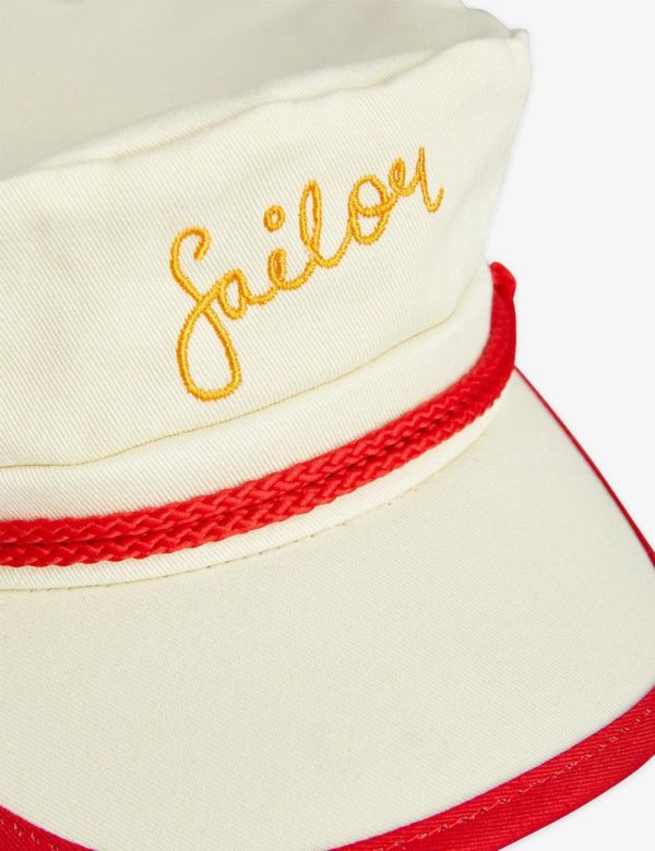 Skipper hat with Sailor embroidery made from 100 % organic cotton. The cap is designed with branded gold metal buttons on the sides and a decorative braided twine over the visor. The back features elastic for a comfortable fit.