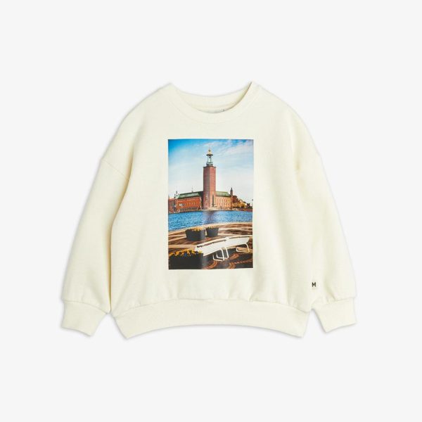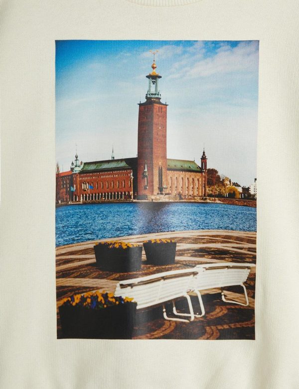 White sweatshirt made in 100 % GOTS-certified organic cotton. Designed with a large print of the iconic City hall in Stockholm.Features