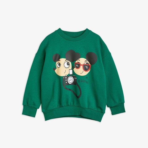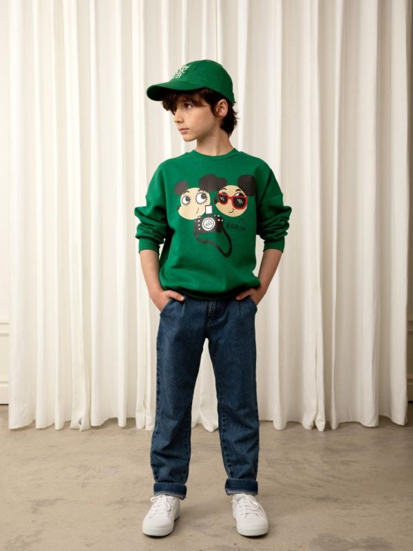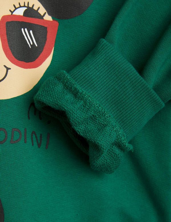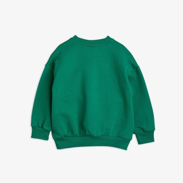 Green sweatshirt featuring a large Ritzratz print in the front, made from 100 % GOTS certified organic cotton. The sweatshirt is designed with dropped shoulders for a relaxed fit and features a ribbed neck, sleeve ends and bottom hem. Snap buttons at shoulder in size 56/62–68/74 for easy dressing.