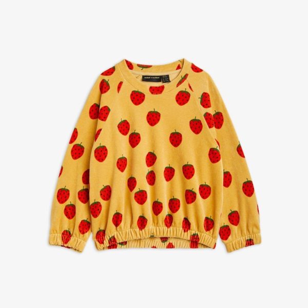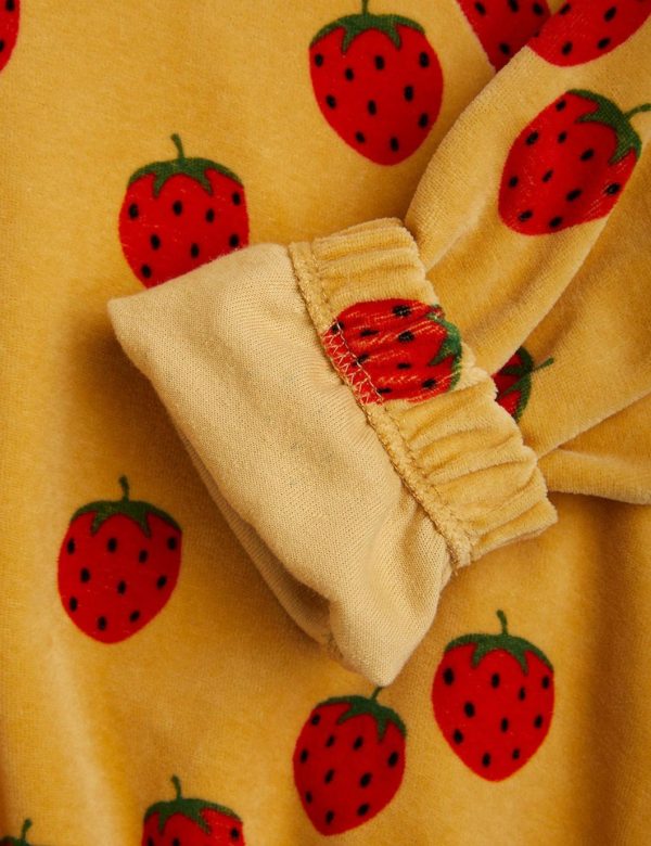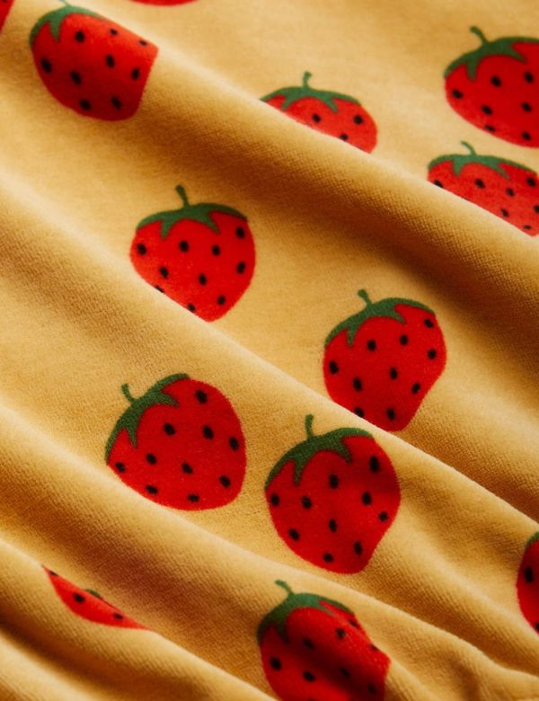 Beige velour sweatshirt with all over Strawberries artwork, made from 100 % GOTS certified organic cotton. The sweatshirt is designed with raglan sleeves and elastic sleeve ends and bottom hem.