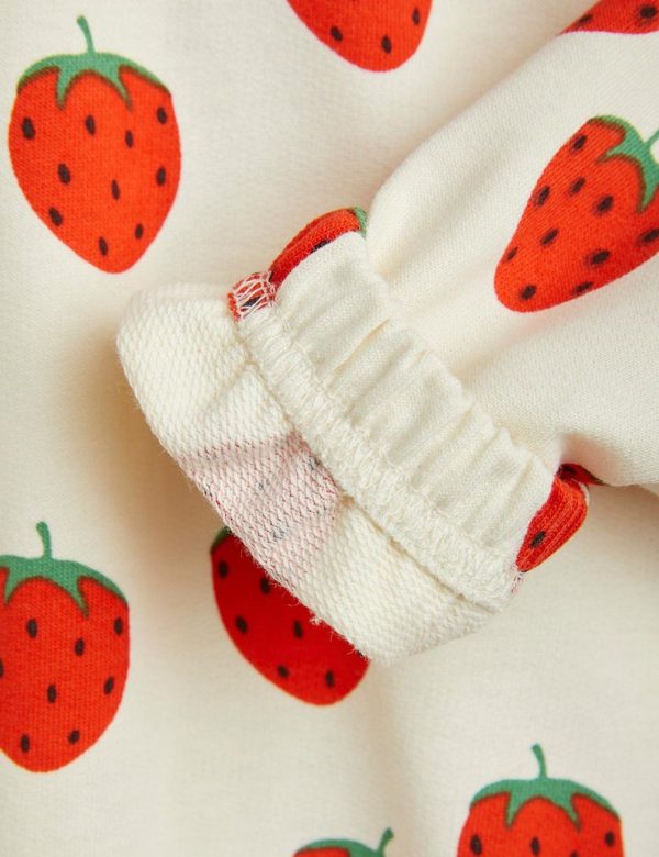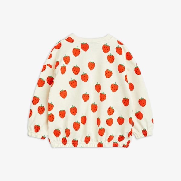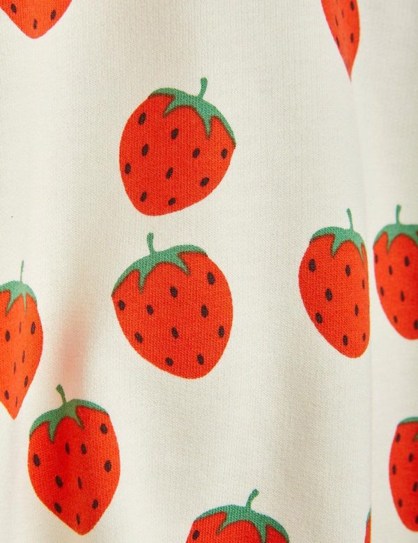 Upcycled off white sweatshirt with an all over Strawberries print made from 100 % GOTS certified organic cotton. Designed with dropped shoulders for a relaxed fit and with ribbed cuffs at the sleeves, neck and bottom hem.
