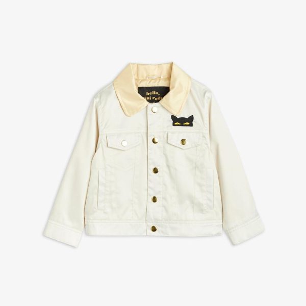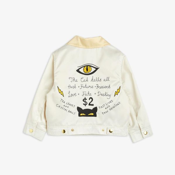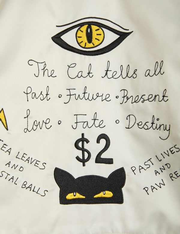 Satin jacket featuring Cat Tells All embroidery, made from 100 % recycled polyester. Wear separately or layer with a warm sweater for colder weather. Designed with metal snap buttons, pockets and a contrasting collar. The jacket is water repellent with a BIONIC-FINISH® ECO coating that is free from hazardous chemicals like fluorocarbons, formaldehyde and paraffin.