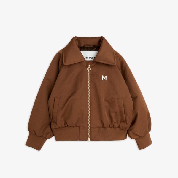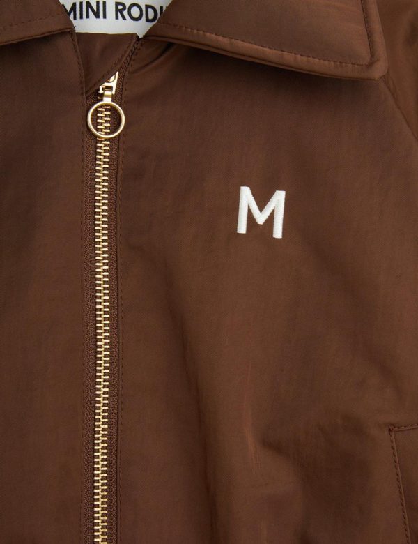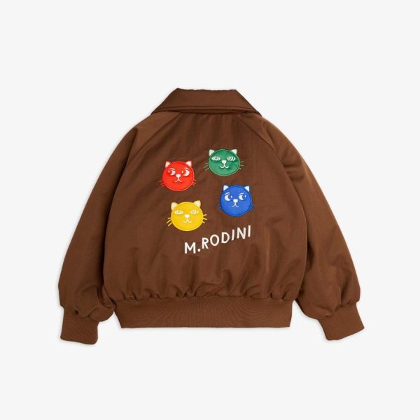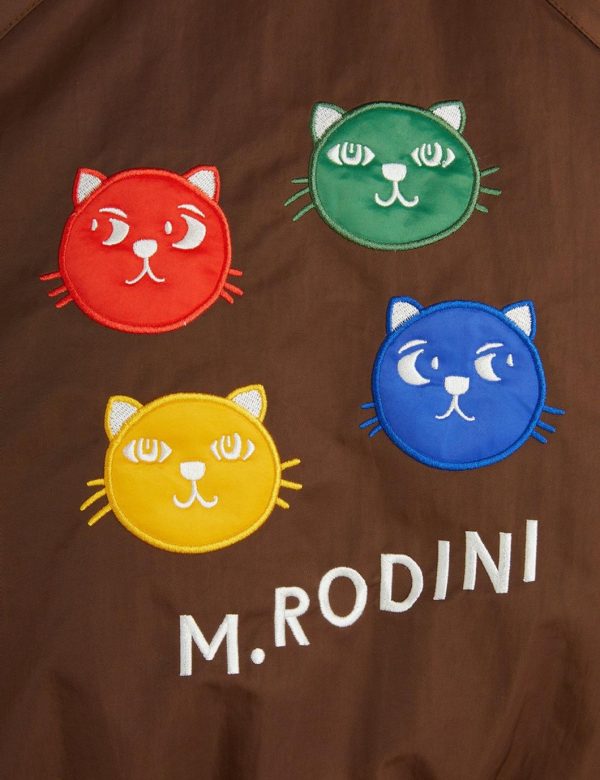 Baseball jacket made from 100% Recycled polyamide with a Bionic finish coating. Designed with a wide 70s collar, visible zipper and elastic at sleeve ends and bottom hem. Cut for a raglan fit with two front pockets. Decorated with a colorful Cool cats applications on the back. The model is 114 cm tall and is wearing a size 116/122.