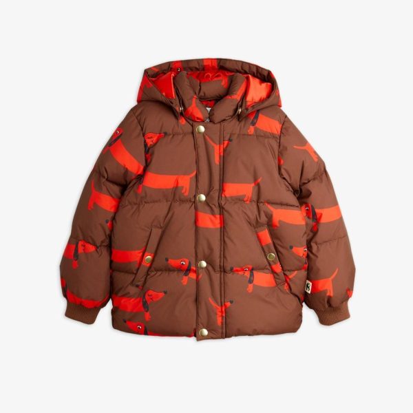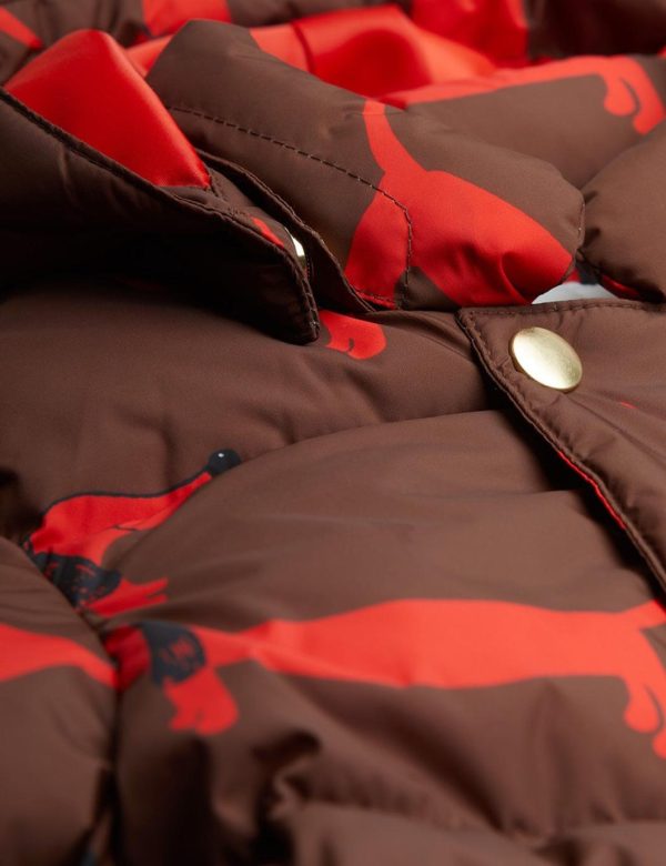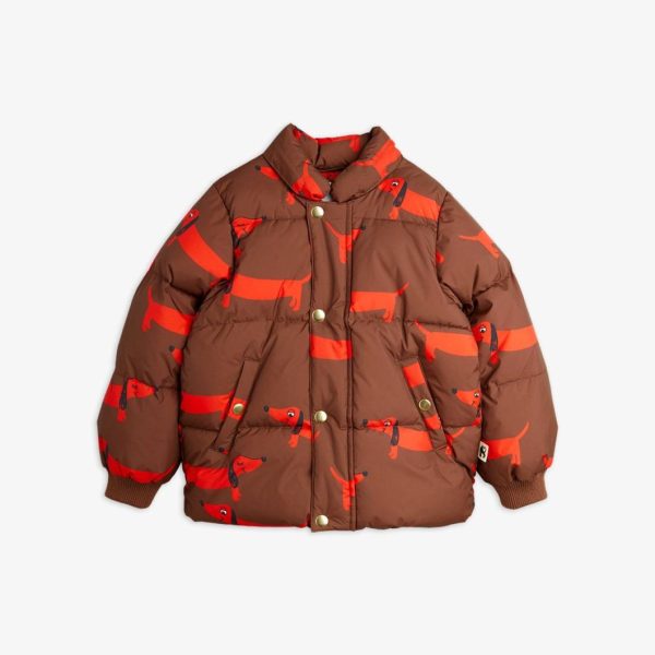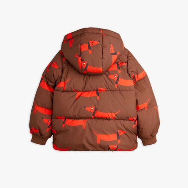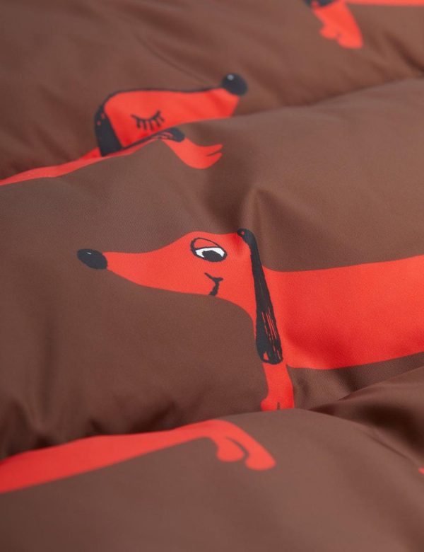 Water repellent and windproof puffer jacket with an all over Dog print, made from 100 % recycled polyester. The jacket is designed with two pockets, a removable hood and elastic cuffs.