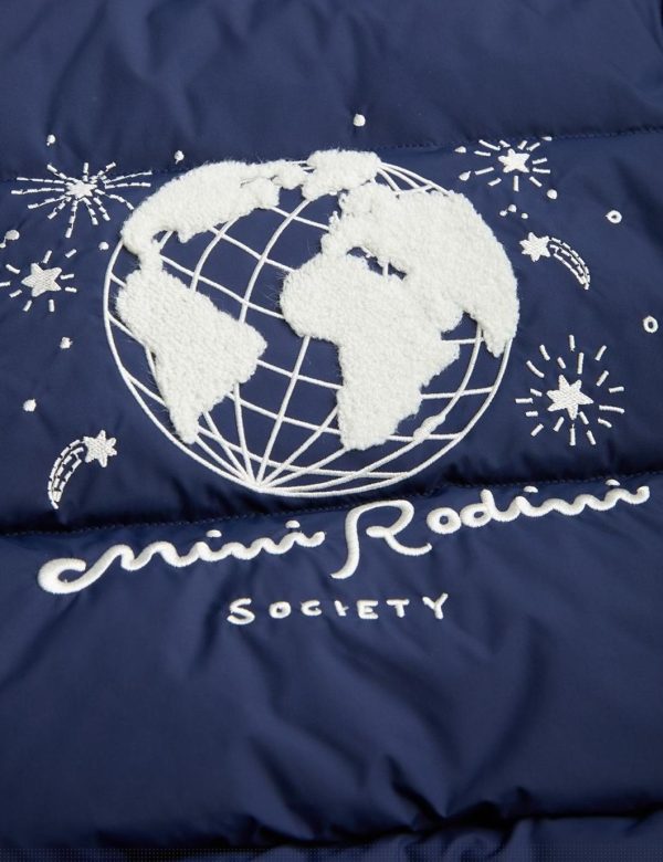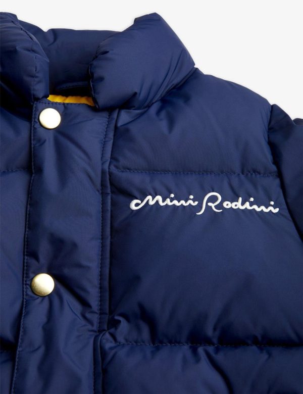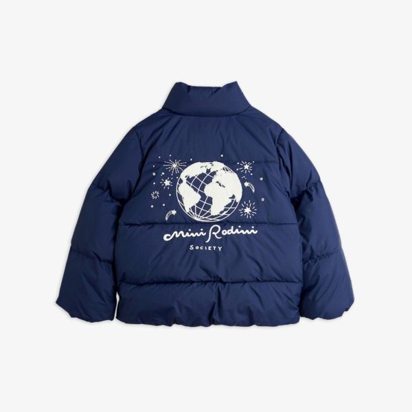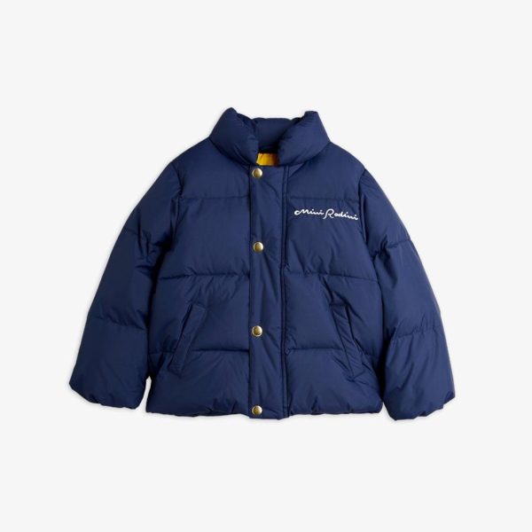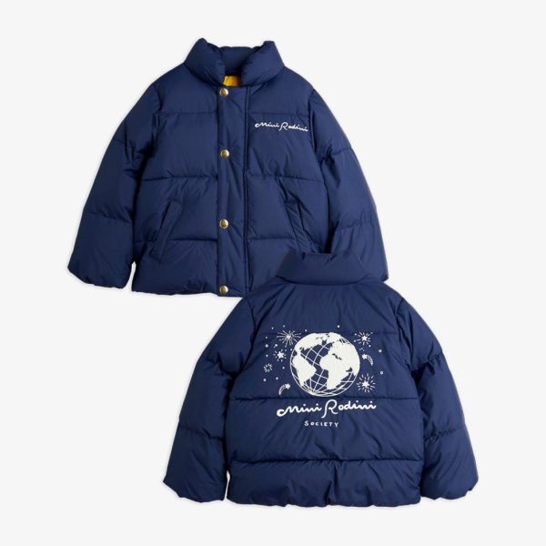 Water repellent and windproof puffer jacket with Mini Rodini Society embroideries on front and back, made from 100 % recycled polyester. Designed with a high collar, two pockets and satin lining.
