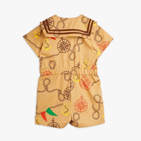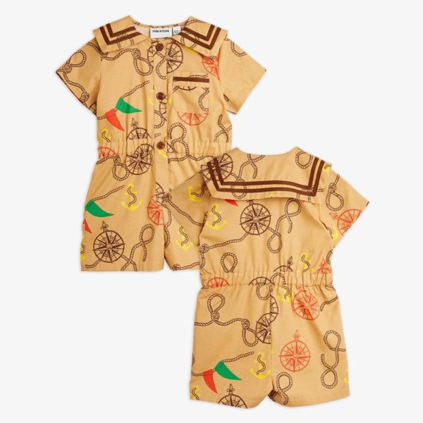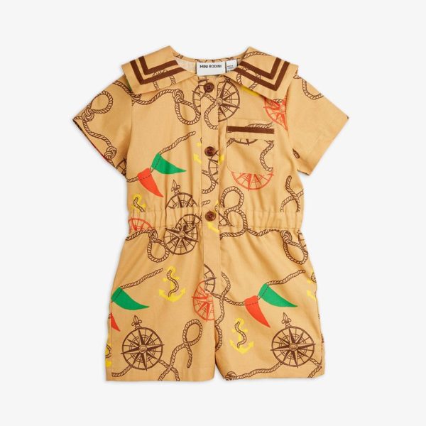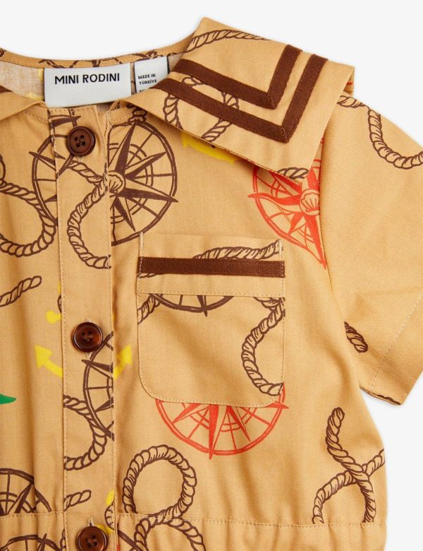 Jumpsuit made from 100 % GOTS certified organic cotton twill. Designed with a sailor collar, front button closure, chest pocket and elastic waist. Decorated with an all over Nautical print.