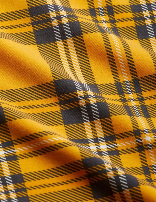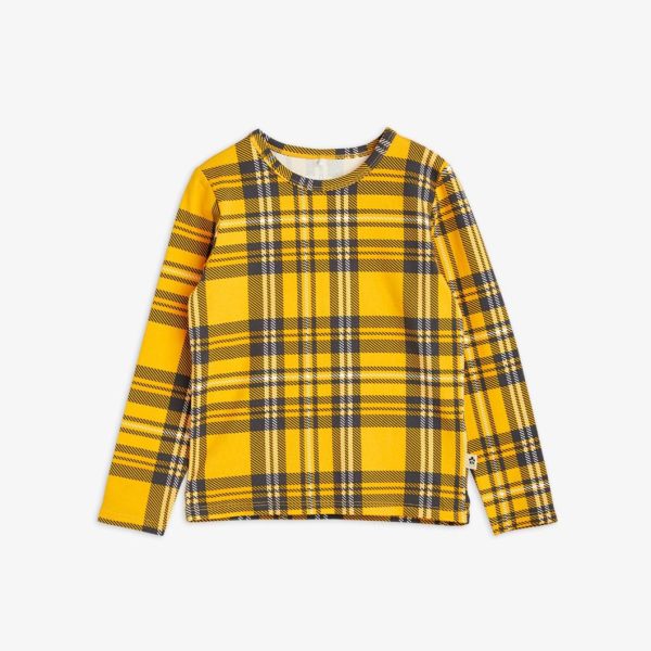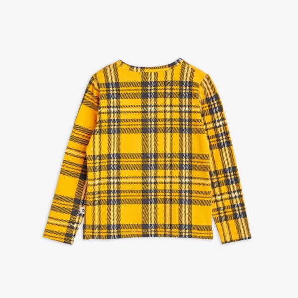 Yellow check printed long sleeve t-shirt made from GOTS certified organic cotton with a hint of stretch. The tee is designed with snap buttons at shoulder in size 56/62–68/74 for easy dressing.