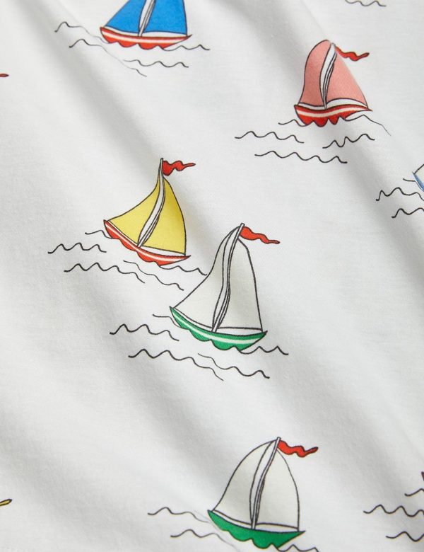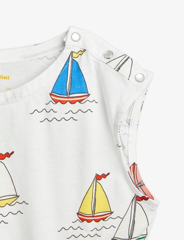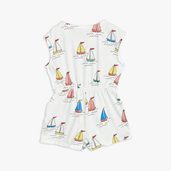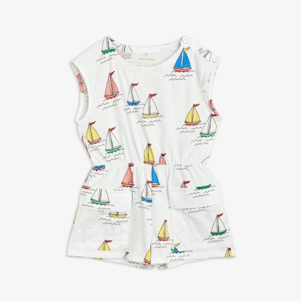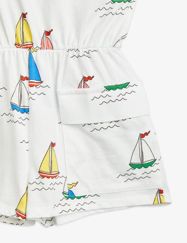 White playsuit with an all over Sailing Boats print, made from 100 % GOTS certified organic cotton. The playsuit is designed with snap buttons on the shoulder, two front pockets and a soft elastic waist.