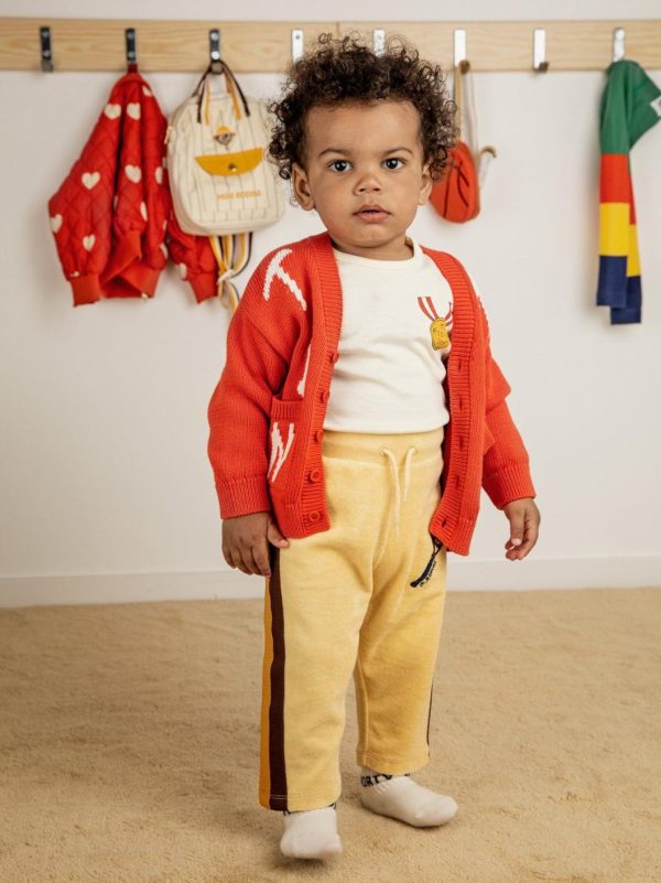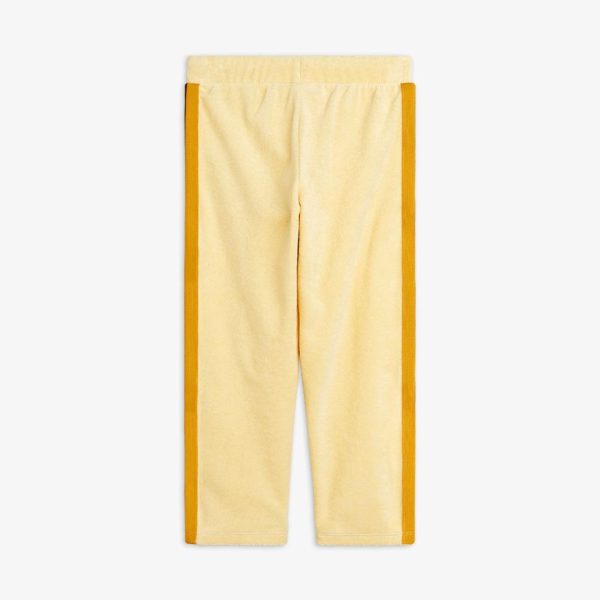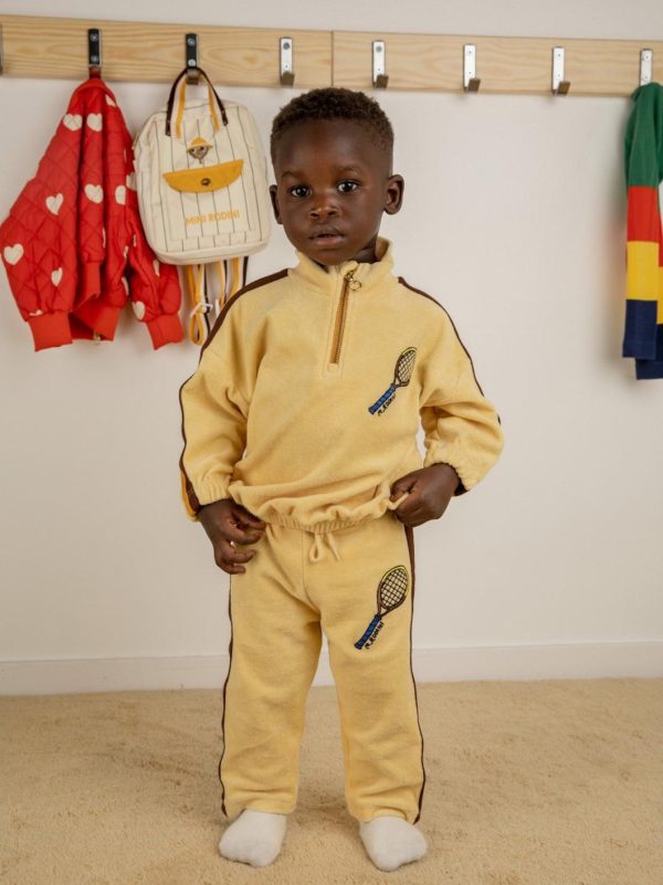 Terry trousers made from 100 % GOTS certified organic cotton. Designed with an elastic drawstring waist and decorated with a Tennis embroidery and stripe detailing along the legs.