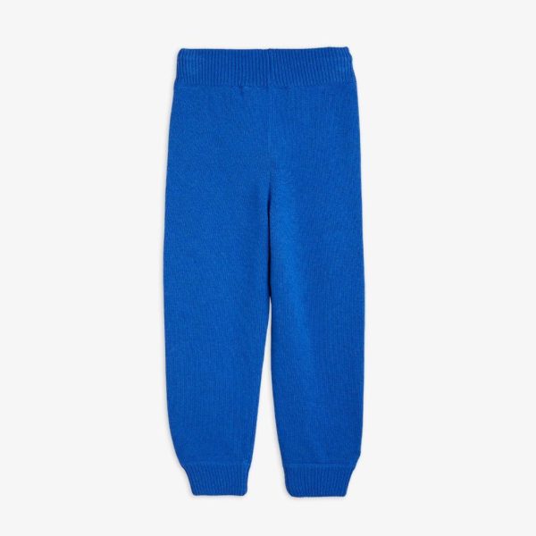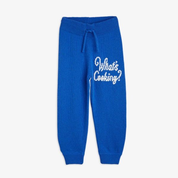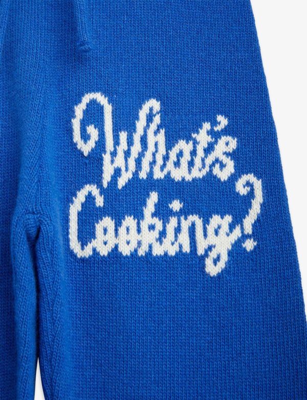 Blue knitted trousers with a What’s Cooking artwork on the left leg, made from a GOTS certified organic cotton and wool blend. Designed with ribbed cuffs at leg ends and a ribbed elastic drawstring waist.