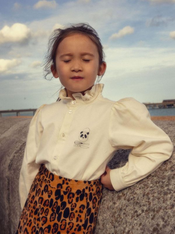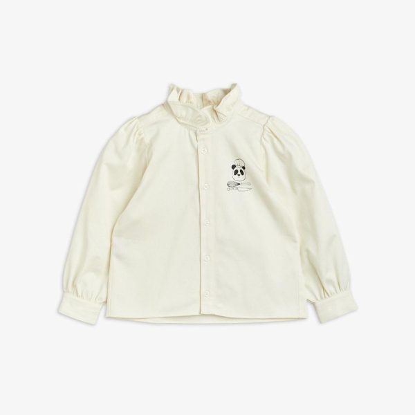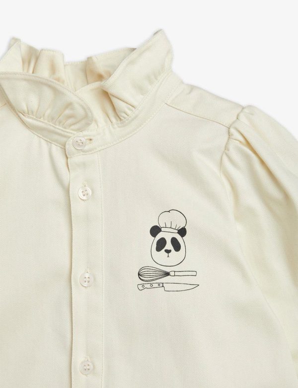 White woven blouse with a Chef Panda print on the chest, made from 100 % GOTS certified organic cotton. The blouse is designed for a normal fit with a high frilled neck, slightly puffed sleeves and buttons closing the front.
