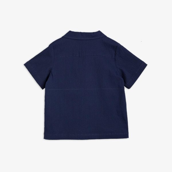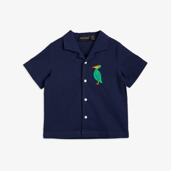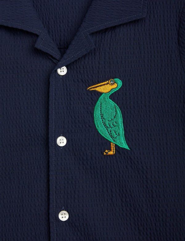 Blue seersucker shirt with a Pelican embroidery on the chest, made from 100 % GOTS certified woven organic cotton.