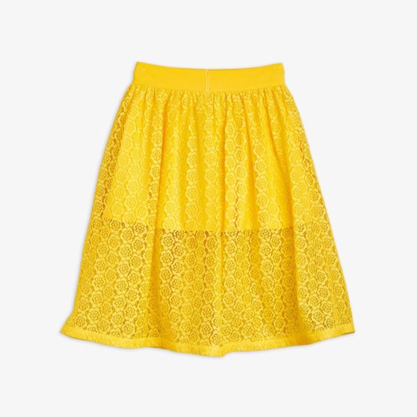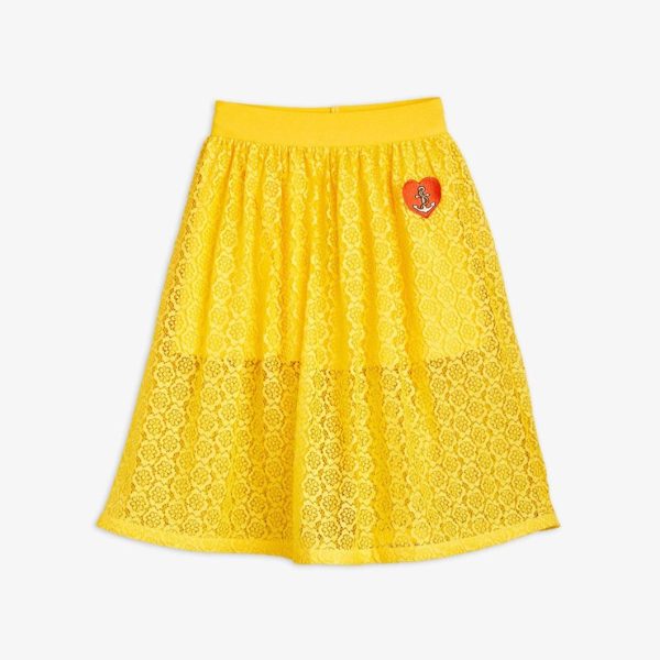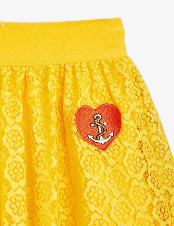 Yellow lace skirt with an embroidered Sailor’s Heart motif, made from a blend of organic cotton and polyamide. Designed to end below the knee, featuring an inner skirt in cotton and an elastic waistband.