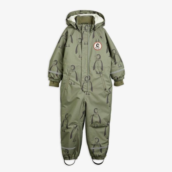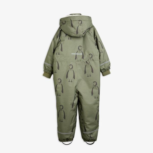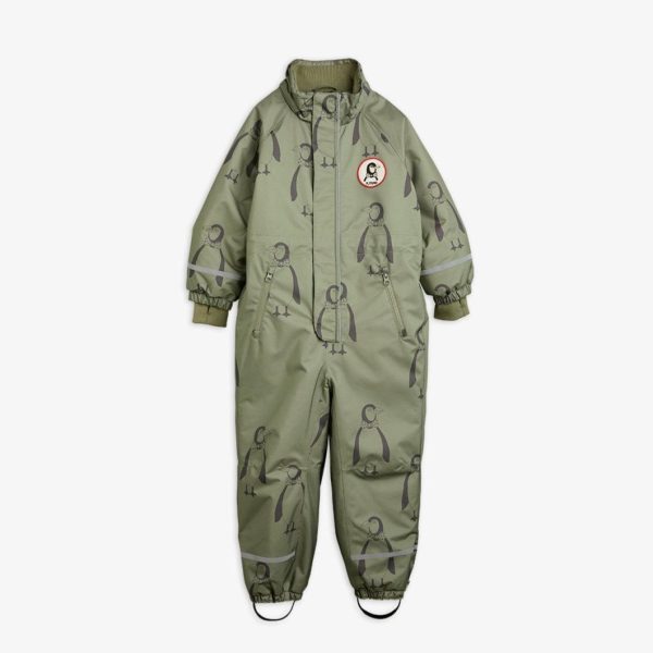 Green padded wind- and waterproof winter snowsuit with all over Penguin print, featuring a detachable hood and microfleece lining, made from 100 % recycled polyester. The snowsuit is made from a heavy-duty and durable shell fabric with taped seams and finished with a more environmentally friendly water repellent BIONIC-FINISH® ECO coating, free from harmful chemicals. The legs are pre-shaped for better movability and the smartly placed reflective stripes increase visibility when the days get darker.
