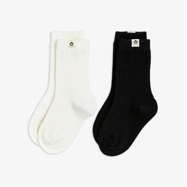 2-pack basic wool socks featuring a Mini Rodini Panda label on the shafts, made from a soft GOTS-certified organic wool blend with stretch. The socks are soft to the touch, comfortably stretchy, and have reinforced toe caps and heels.