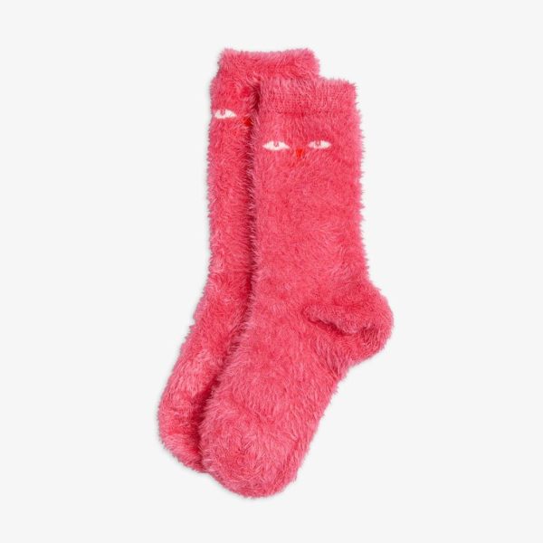Pink fuzzy socks featuring Cats artworks, made from recycled polyester. The socks are soft to the touch, comfortably stretchy and have reinforced toe caps and heels.