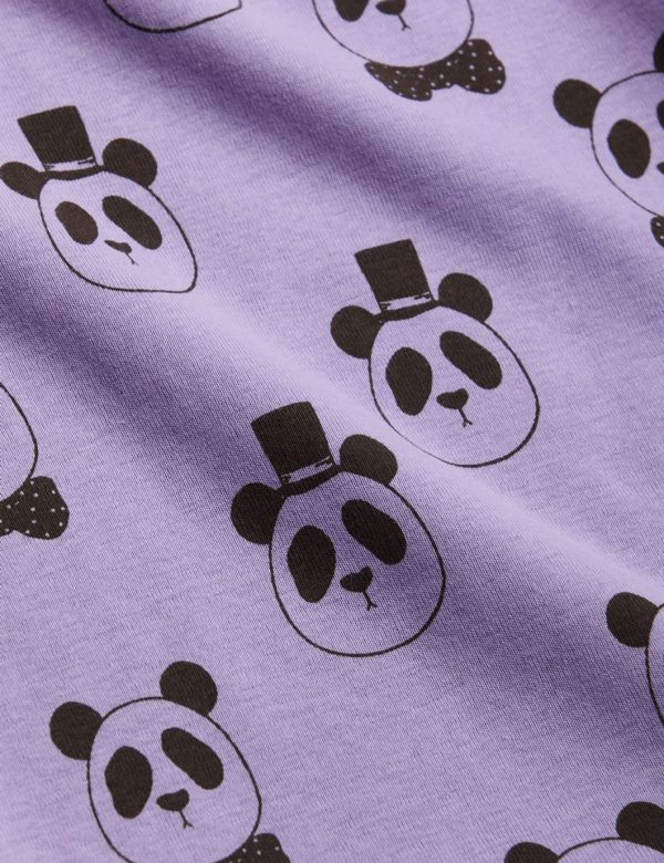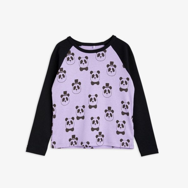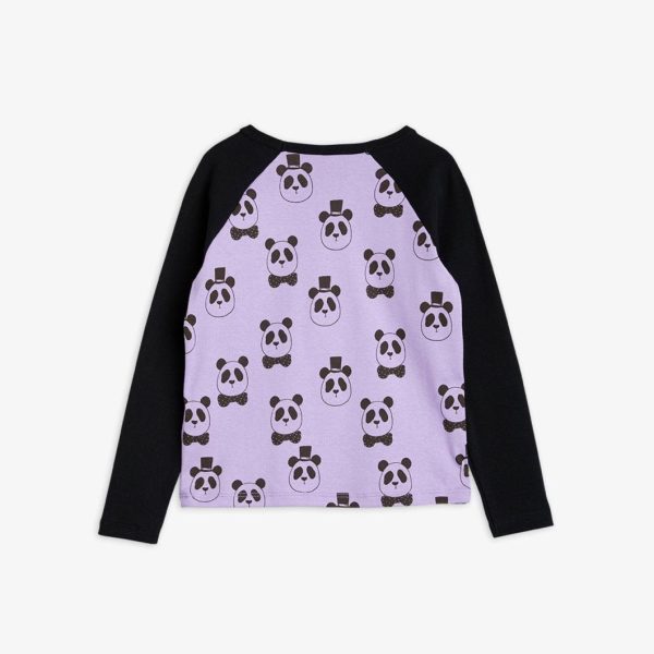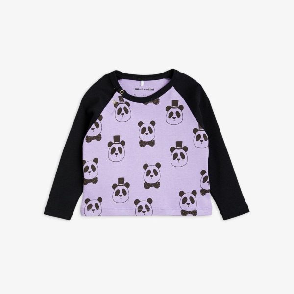 Purple long sleeve tee with dark grey raglan sleeves and all over Panda print, made from 100 % GOTS certified organic cotton. The tee has snap buttons at the shoulder in the smallest sizes (56/62–68/74) for easy dressing.