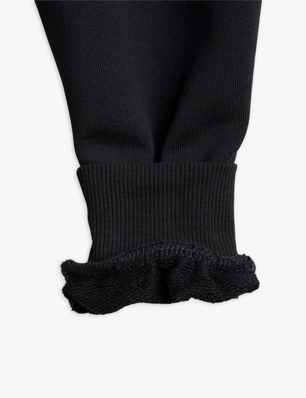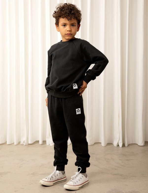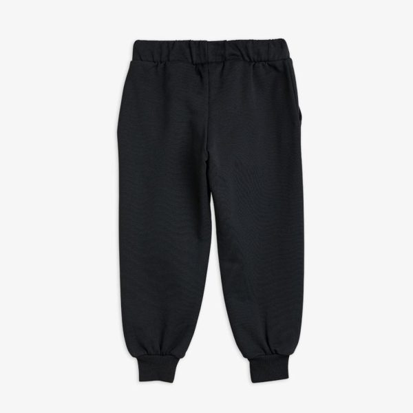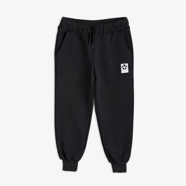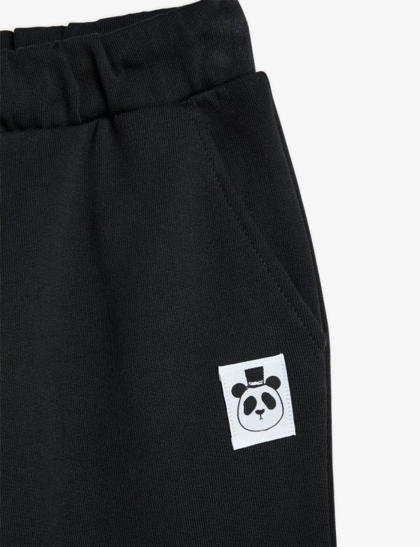 Black sweatpants made from 100 % GOTS certified organic cotton. The sweatpants are designed with a Mini Rodini Panda label on the left leg, ribbing at the waist and cuffs, two pockets as well as an elastic drawstring waist.