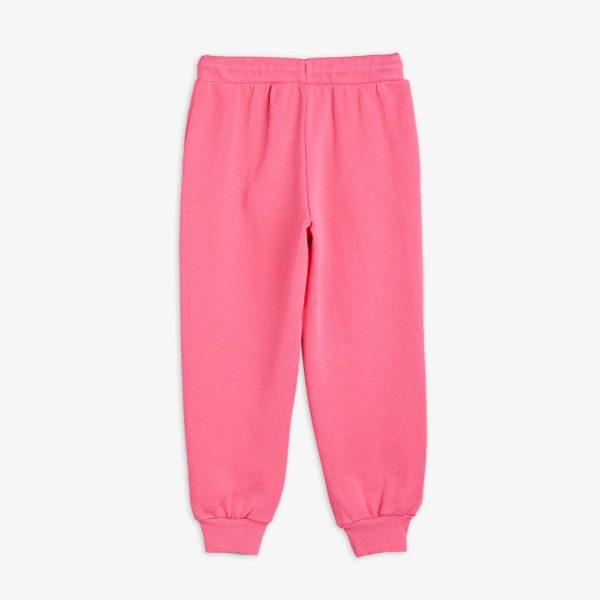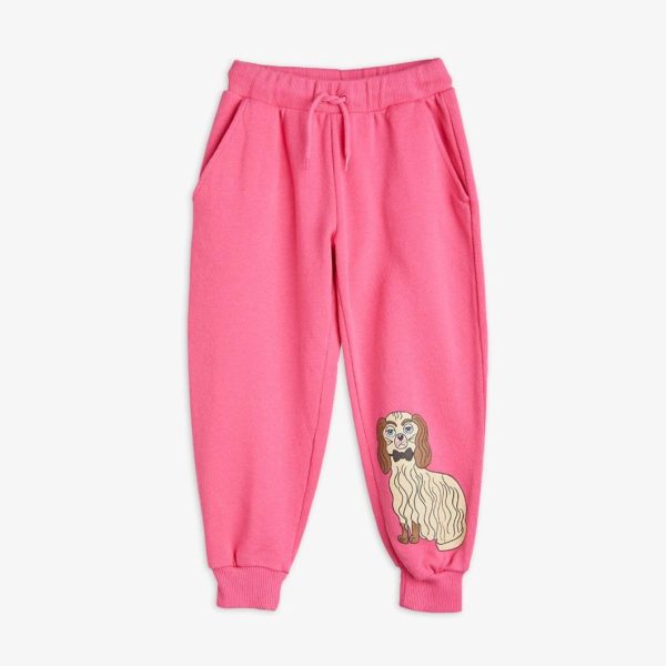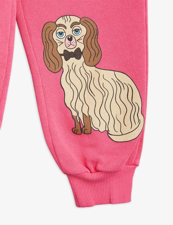 Pink sweatpants featuring a Dashing Dog print on the left leg, made from 100 % GOTS certified organic cotton. The sweatpants are designed with ribbing at the waist and cuffs, two pockets as well as an elastic drawstring waist.