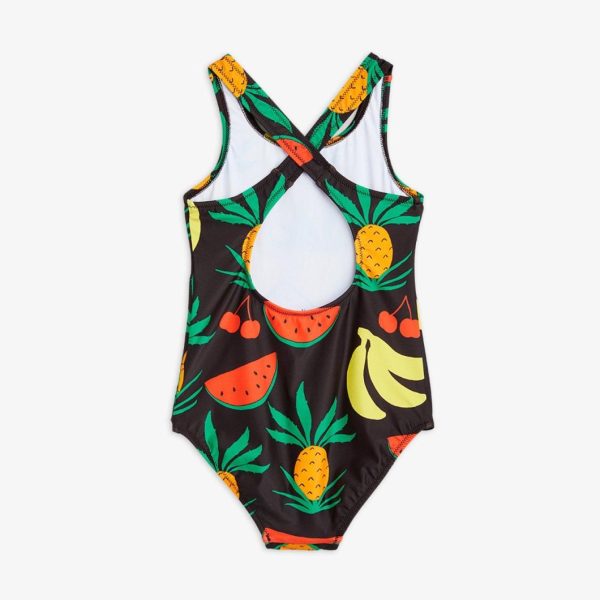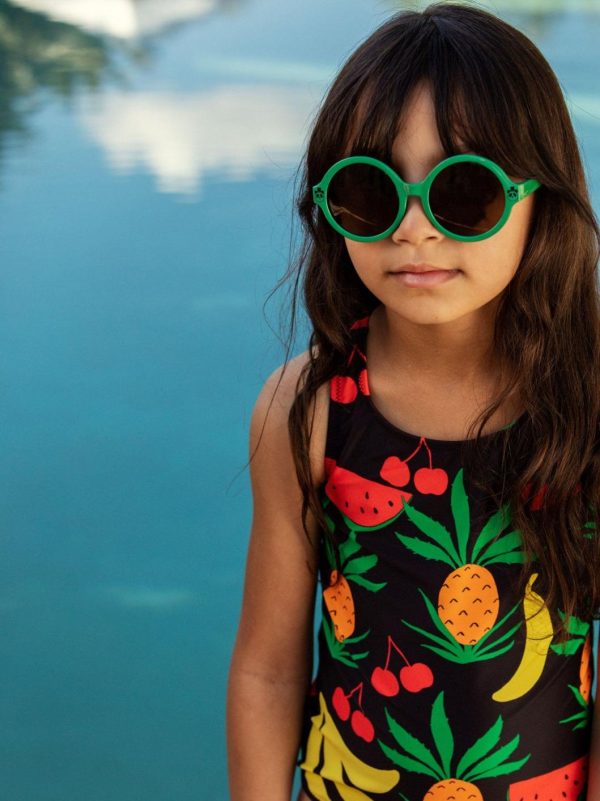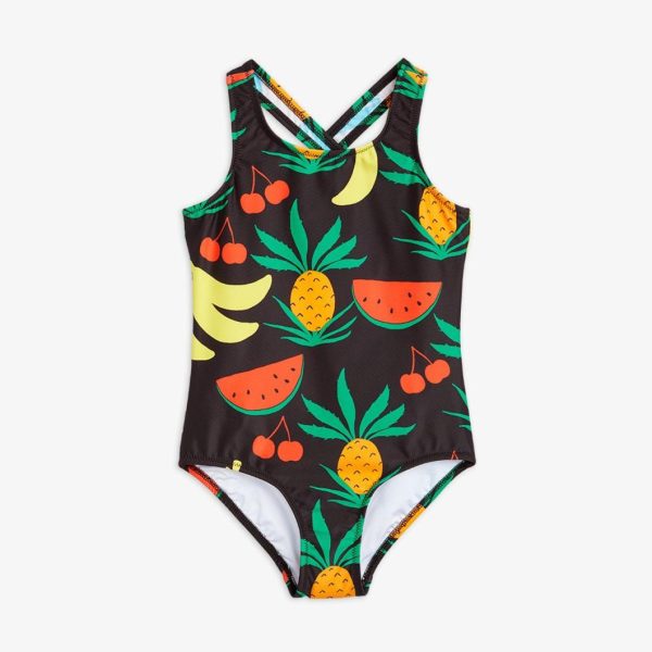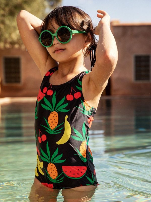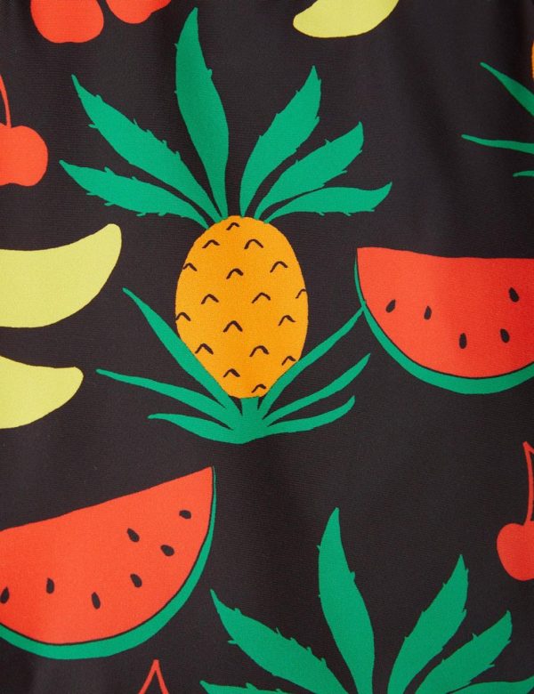 Brown cross back swimsuit with all over Fruits print, made from ECONYL® regenerated nylon with stretch. The fabric protects against the sun’s UV rays with the highest ultraviolet protection factor, UPF 50+.